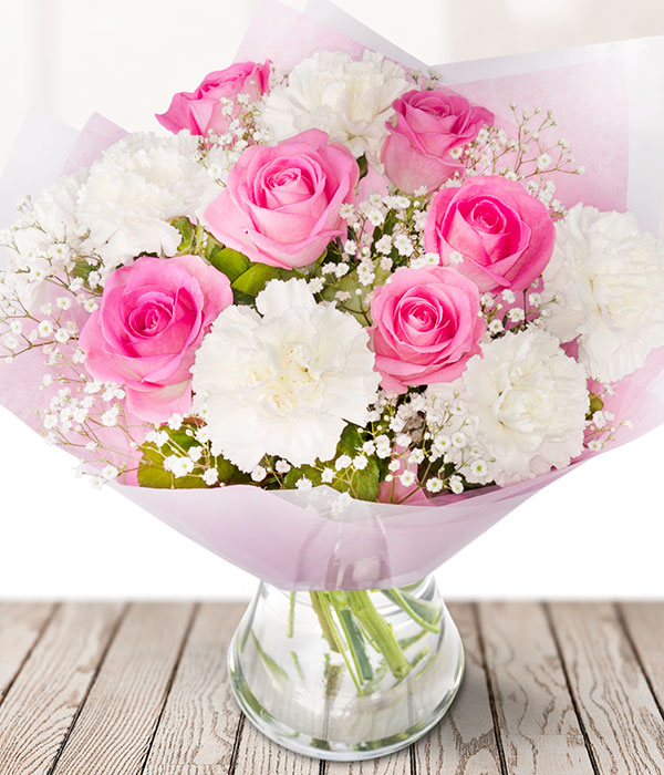White carnations nestled in amongst pretty pink roses and gypsophila make up this delicate bouquet. Delivered in bud for longevity, these unbeatably priced blooms promise to unfold their magic gradually after reaching the lucky recipient. Sent in our signature Eflorist box for safe transit, this bouquet is sure to enchant the recipient from the moment they open it. Enjoy our nationwide delivery and know exactly when the flowers are delivered with tracking. Eflorist, where value meets beauty.