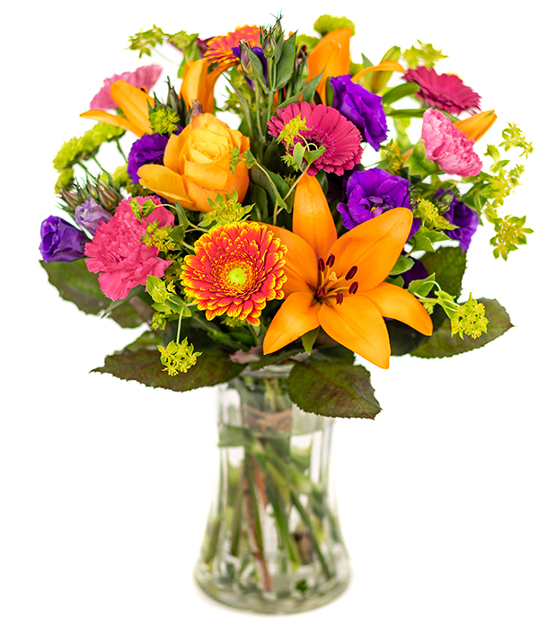 A bouquet to showcase our favourite blooms! Containing a mixture of bright orange lilies and roses, cerise carnations and germini, and a variety of foliage to complement. Sent in a special Eflorist box designed to protect the stems and provide a pleasant unboxing experience. The flowers arrive in bud, and with just a splash of water and our included flower food, the blooms will gradually open up within two days. And with tracked delivery know exactly when the surprise reaches your loved one. Experience the perfect balance of quality and affordability with this stunning bouquet.