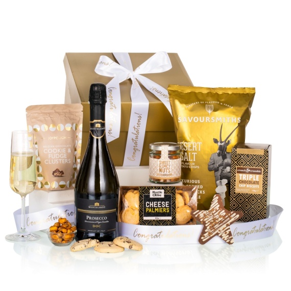 Our Cheers to You hamper celebrates with wine, nuts, biscuits and sweet treats including cookies, flapjacks and fudge. Finished with a celebratory ribbon, it’s a joyful gift that marks special moments with excellent wine and delicious nibbles. This hamper contains 7 items: Cambrook Sweet & Spicy Nut Mix 75g Crunch & Crumble Triple Chocolate Biscuits 150g Joypouch Cookie & Fudge Clusters 100g Myrtle & Olive Cheese Palmiers 80g Savoursmiths Desert Salt Crisps 150g Stas Chocolatier Decorated Milk Chocolate Star 50g Prosecco DOC Montecampo Italy 75cl 10.5% vol Delivered in a gold gift box with ribbon.