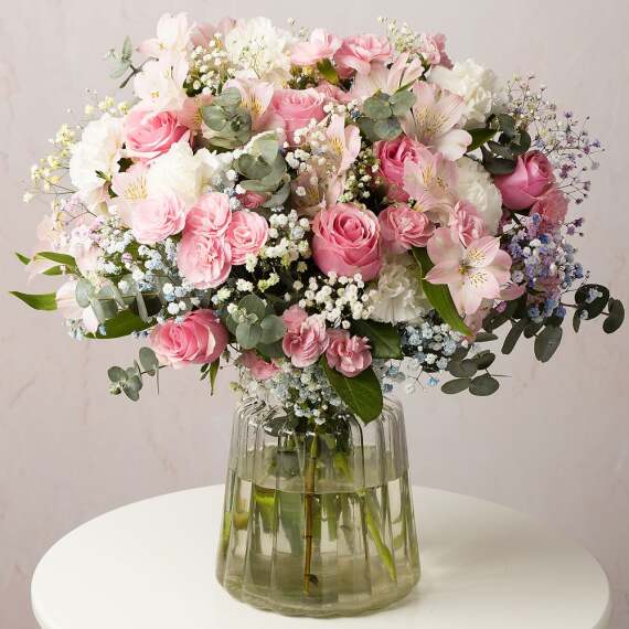 A beautiful arrangement of pink Roses, Alstroemeria and Spray Carnations accompanied by Eucalyptus and fun ‘rainbow’ Gypsophila. A lovely flower gift for any occasion.