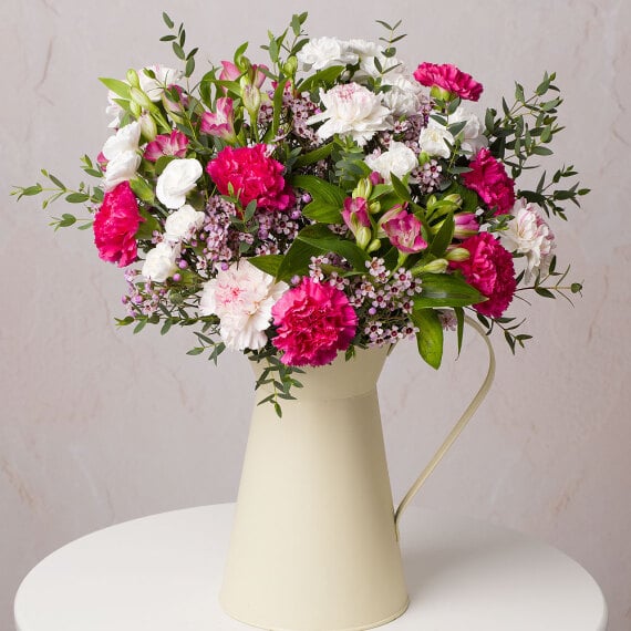 A beautiful combination of long-lasting Carnations in shades of pink and white, with pollen-free Alstroemeria. Paired pink Wax Flower and lush Eucalyptus foliage, this large bouquet is ideal for making special occasions even more memorable.